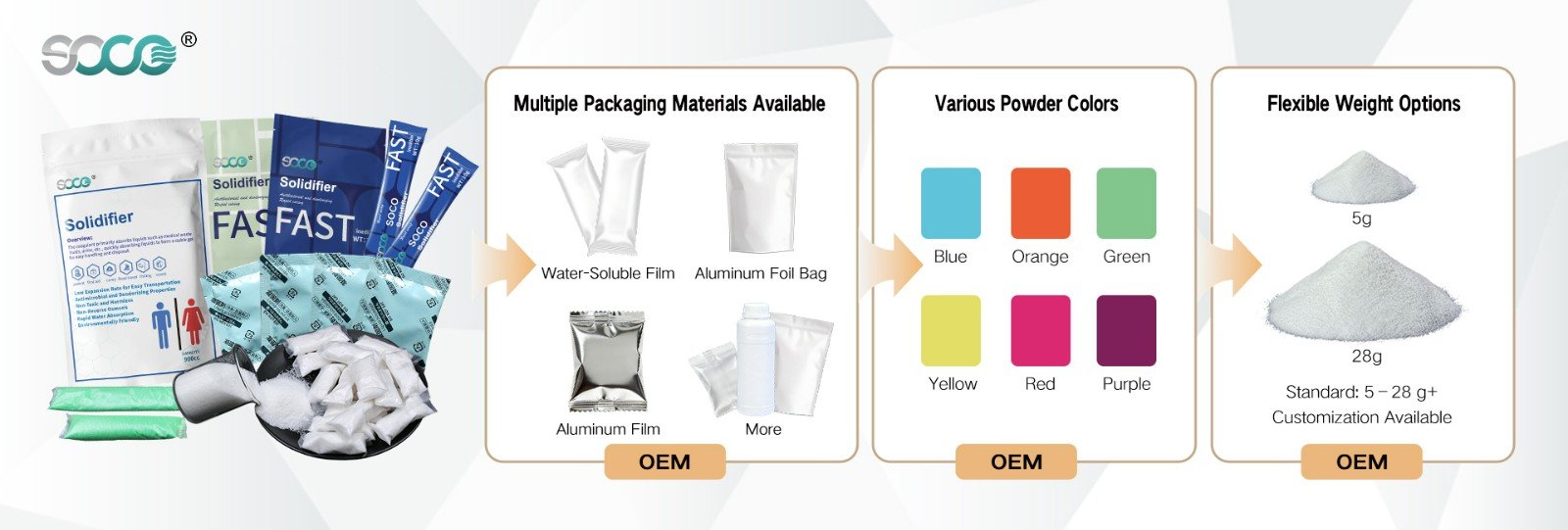 Packaging Materials: A variety of materials are available, including aluminum foil bags, PE, and PVA/water-soluble paper bags. Customer logos and instructions can be printed on them.